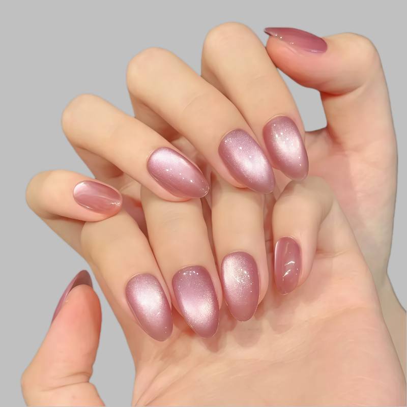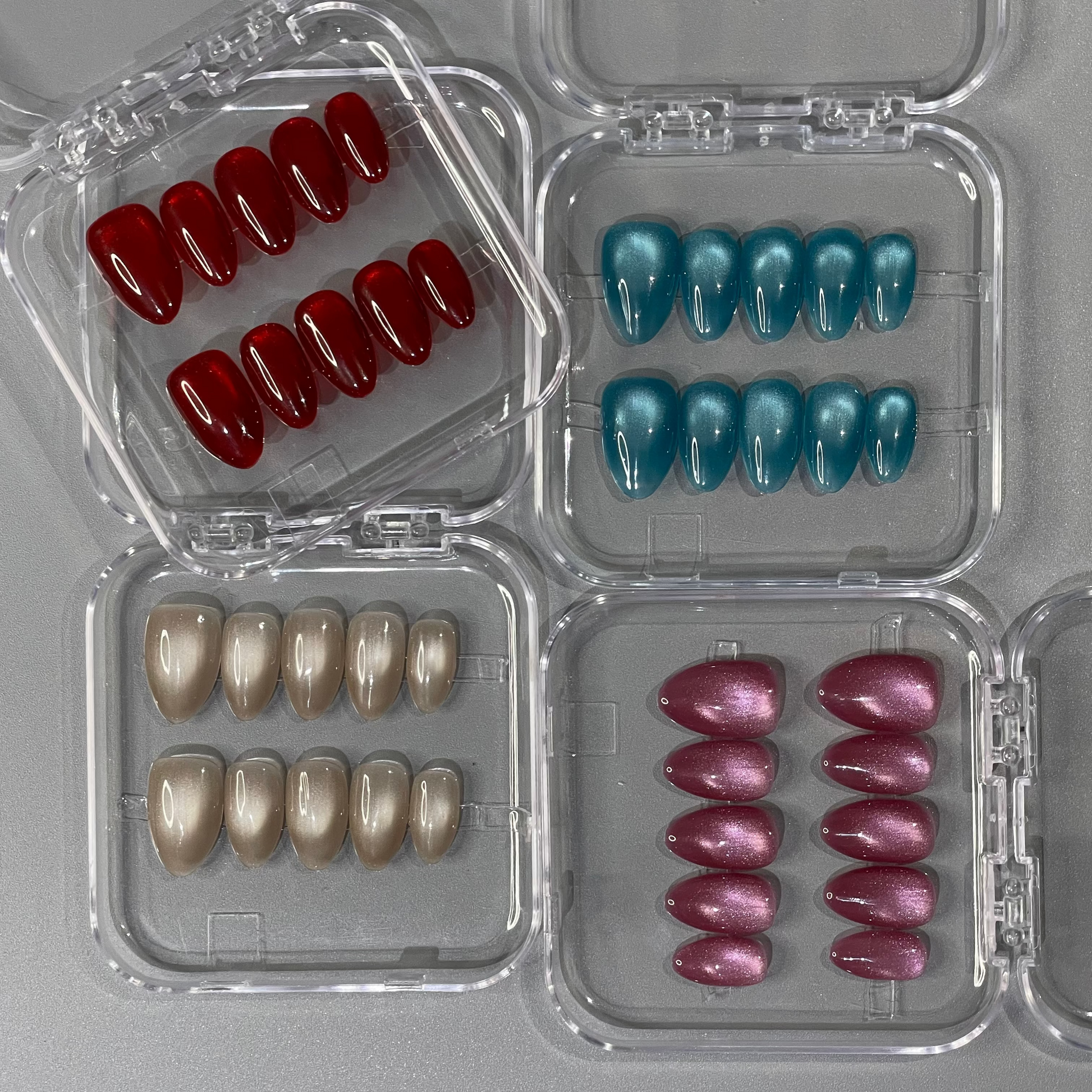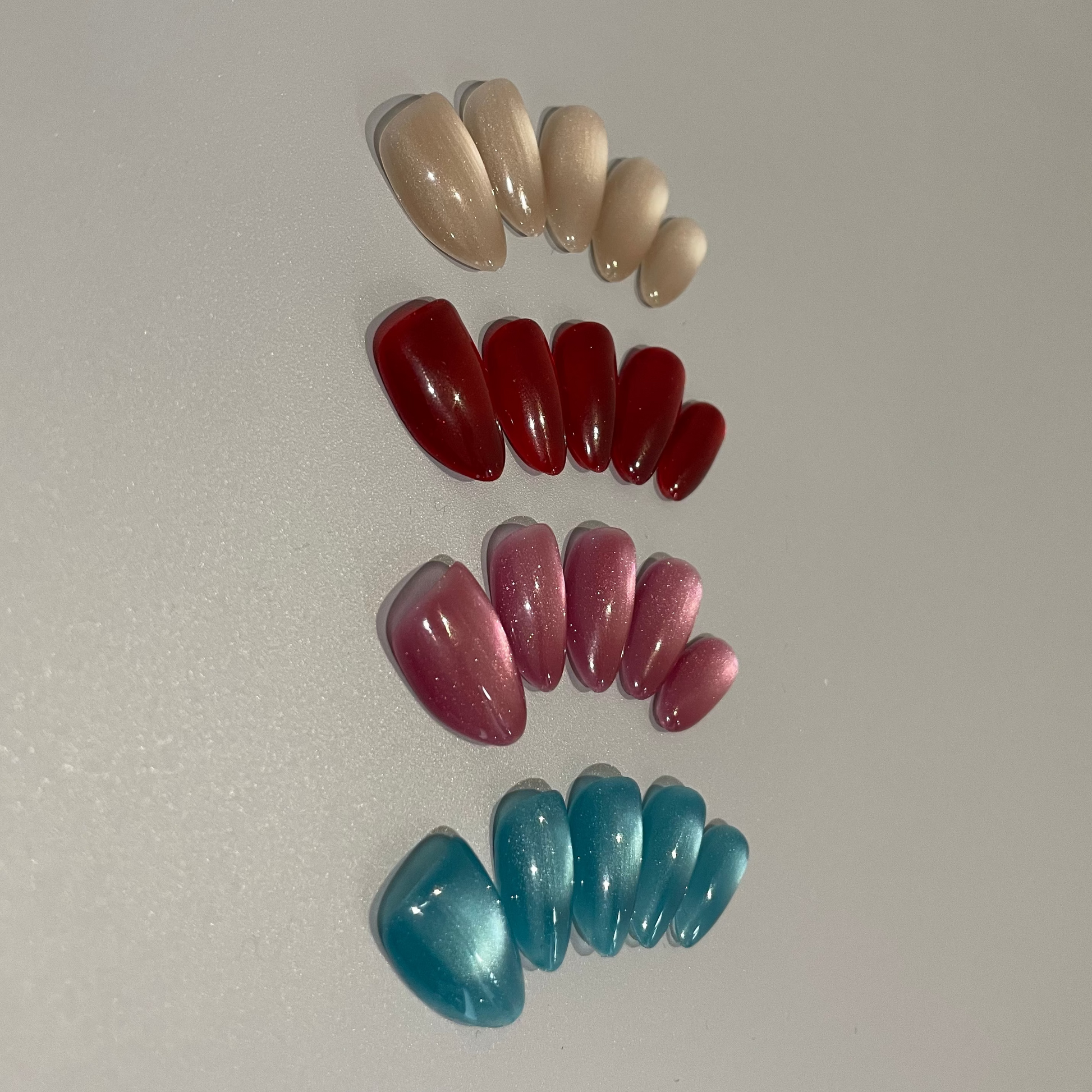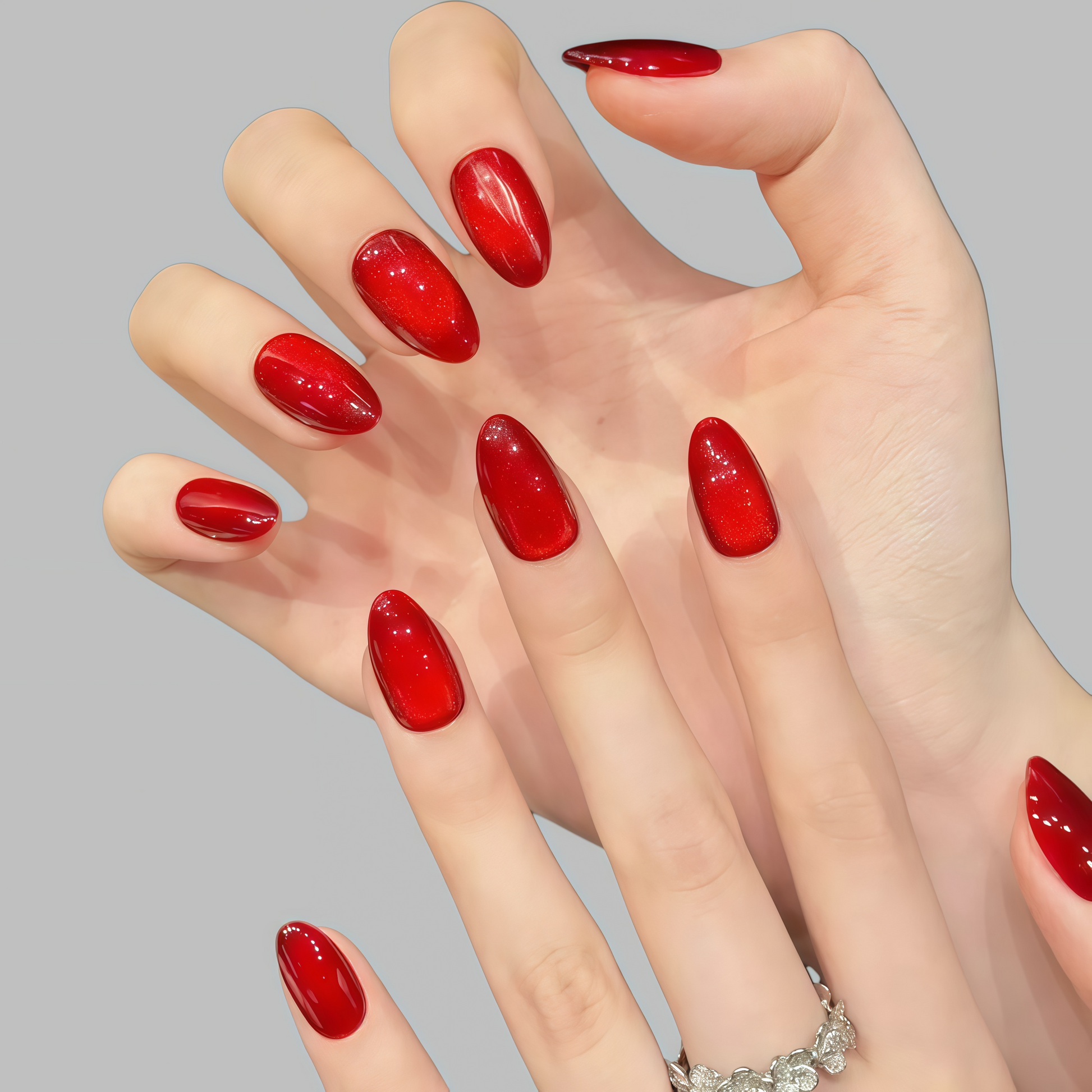 A rich ruby-red cat-eye press-on set with a magnetic shifting glow. Bold, glossy, and perfect for making a statement.