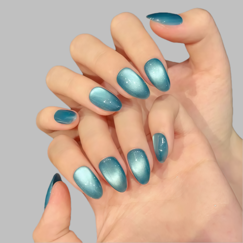 A vibrant aqua-blue cat-eye design with a striking reflective beam. Fresh, modern, and full of dimension.