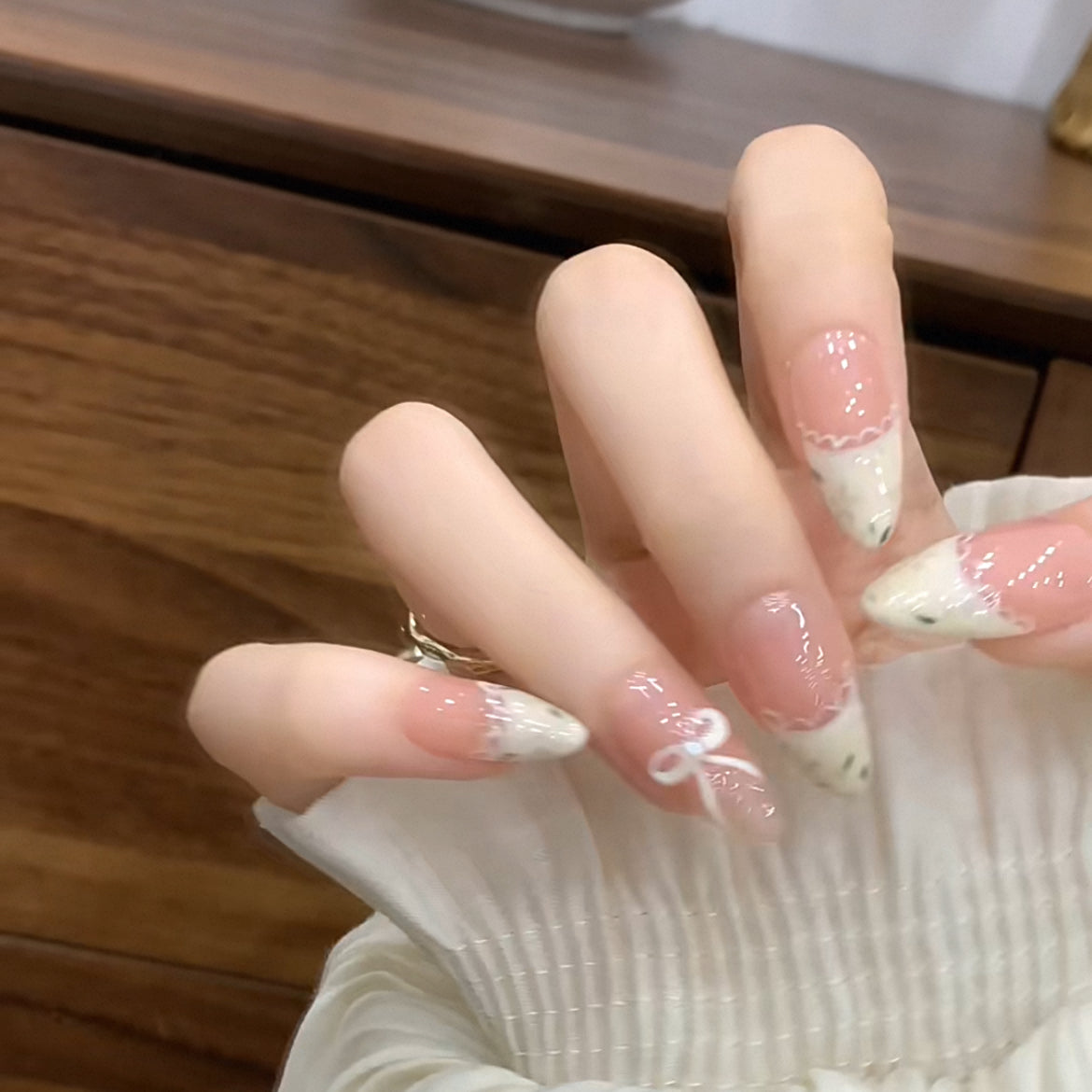 The Lace Bow French set features soft nude bases paired with delicate lace-style white tips and a sweet 3D bow accent for an elegant, feminine finish. Perfect for brides, soft-girl looks, or anyone who loves romantic, dainty nail designs.