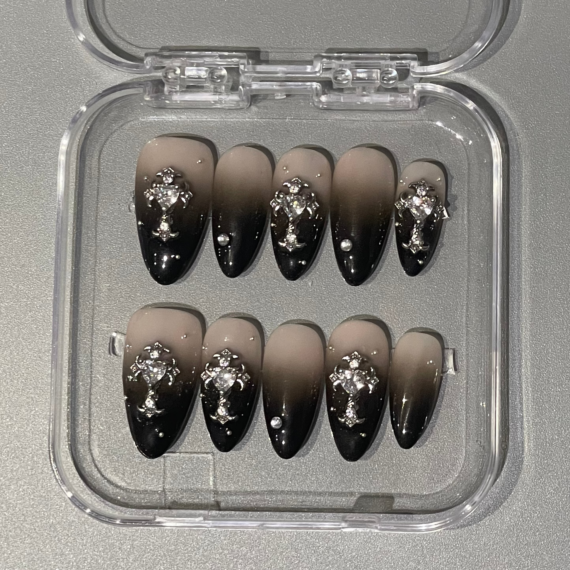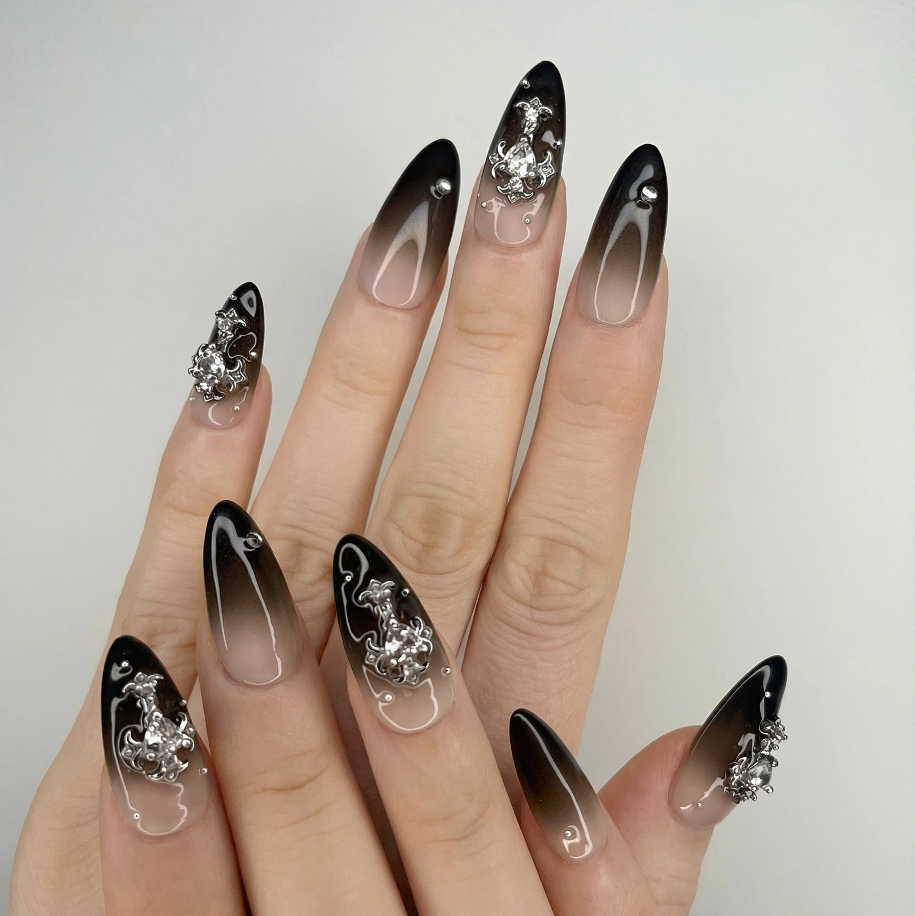 The Midnight Crystal set features a sleek nude-to-black ombré base adorned with silver crystal clusters and glossy mirror highlights. Bold, feminine, and luxe, this set is perfect for nights out, events, or anyone who loves elegant dark nails with a touch of sparkle.