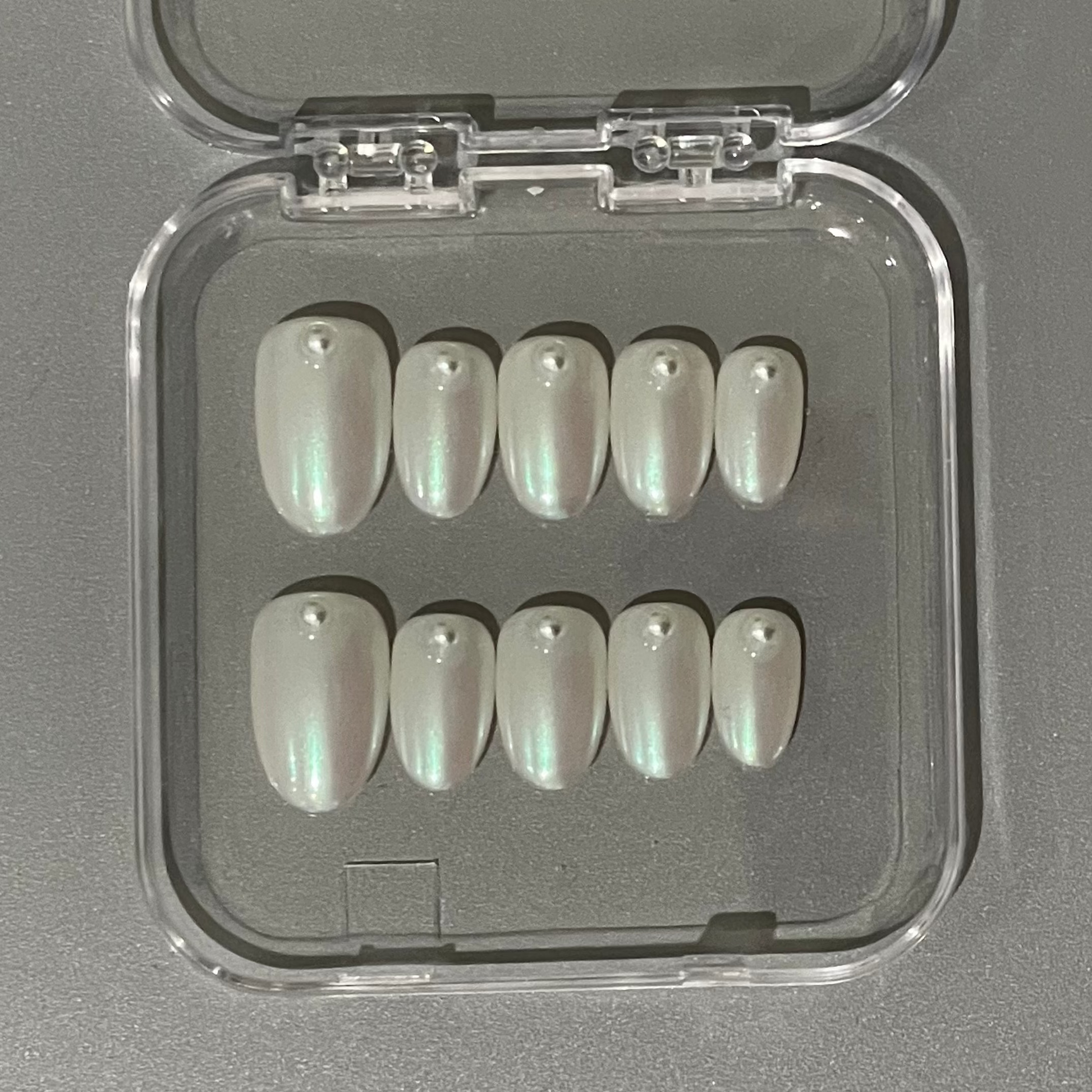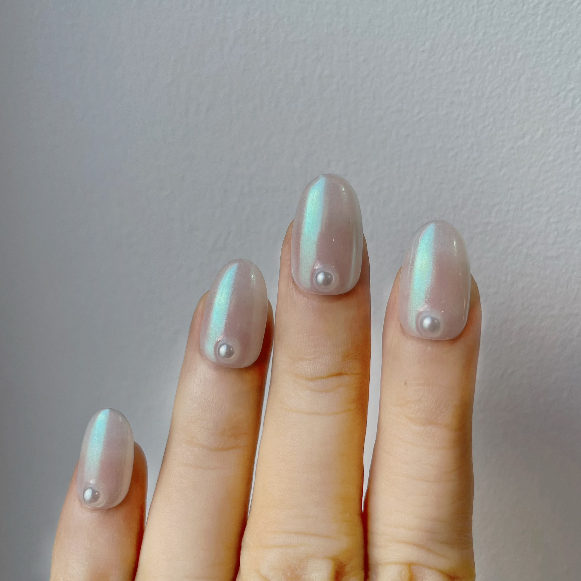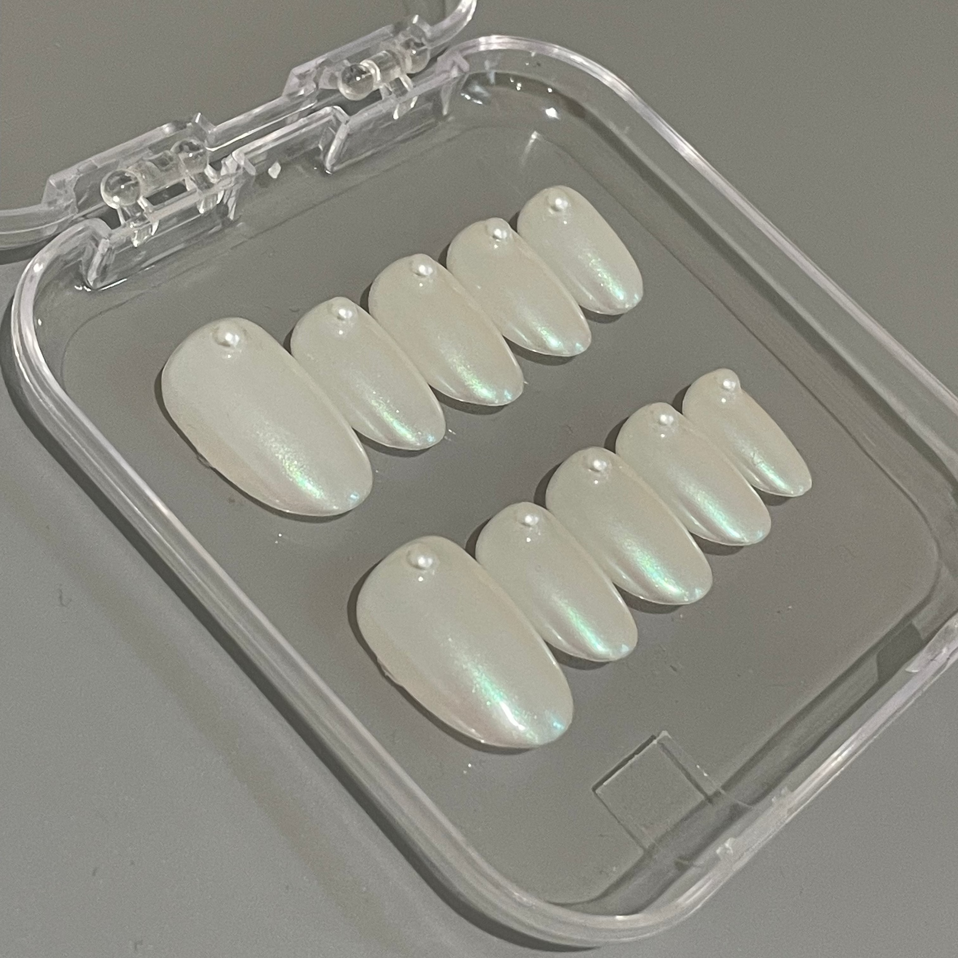 Pearl Glow is a soft nude press-on nail set with a delicate iridescent sheen and a single pearl accent on each nail. Elegant, feminine, and effortlessly chic, this design gives a subtle glow that catches the light beautifully — perfect for everyday wear, weddings, or a clean, polished look.