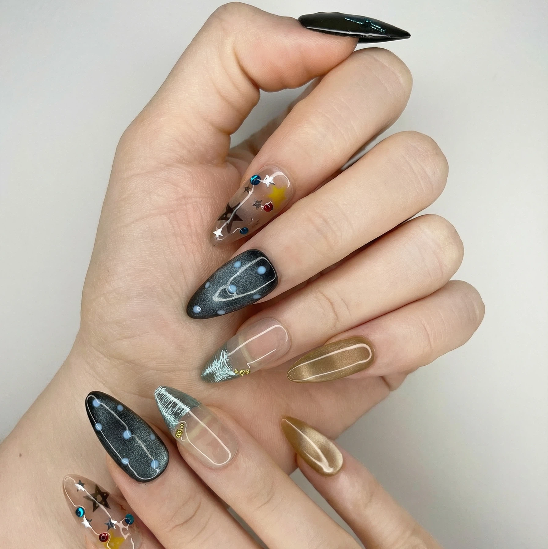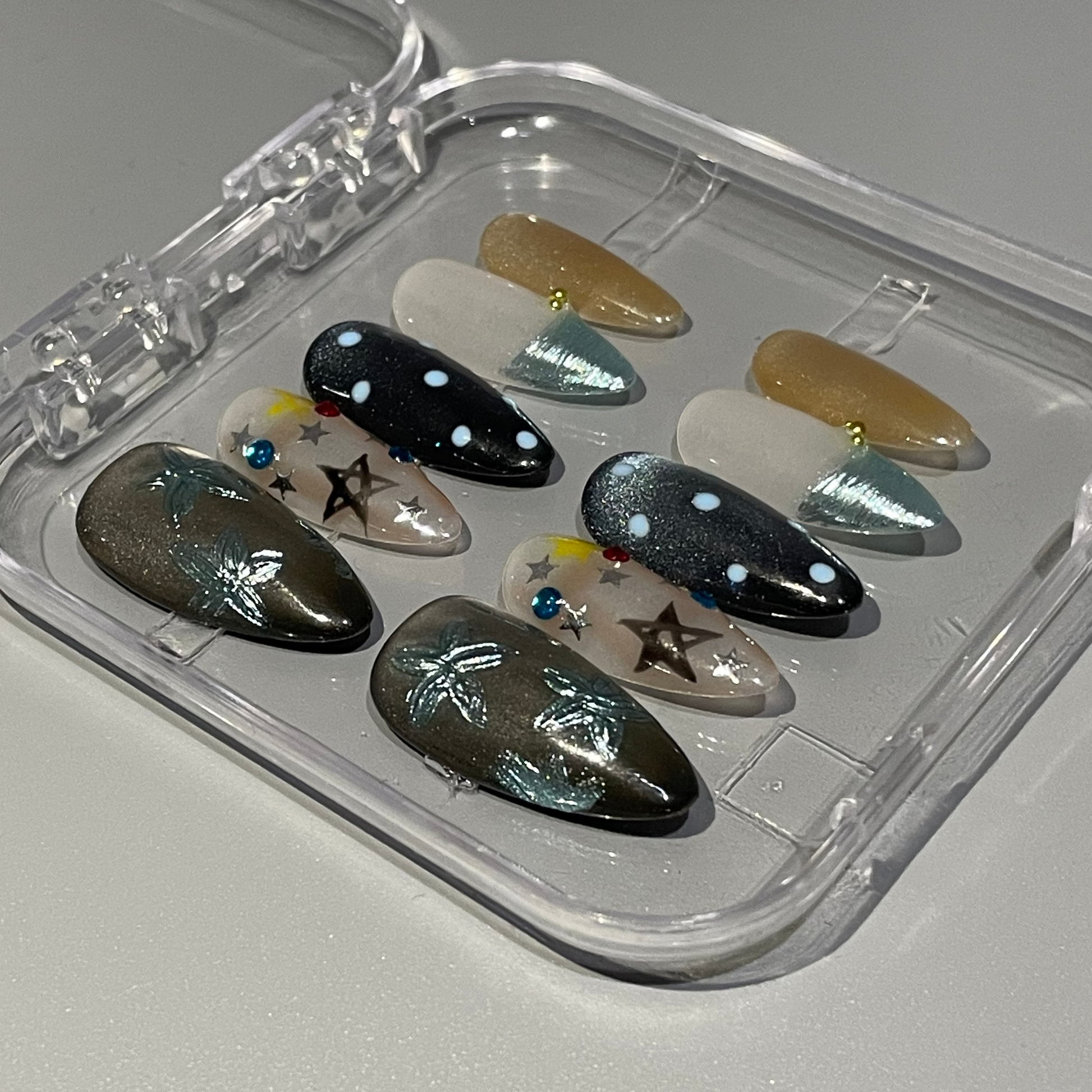 The Starry Blue Mix set combines soft blue florals, pastel stars, dotted night-sky accents, and cute wrapped-tip designs for a fun, creative, and feminine look. Perfect for anyone who loves unique mix-and-match nail art with a dreamy, whimsical vibe.