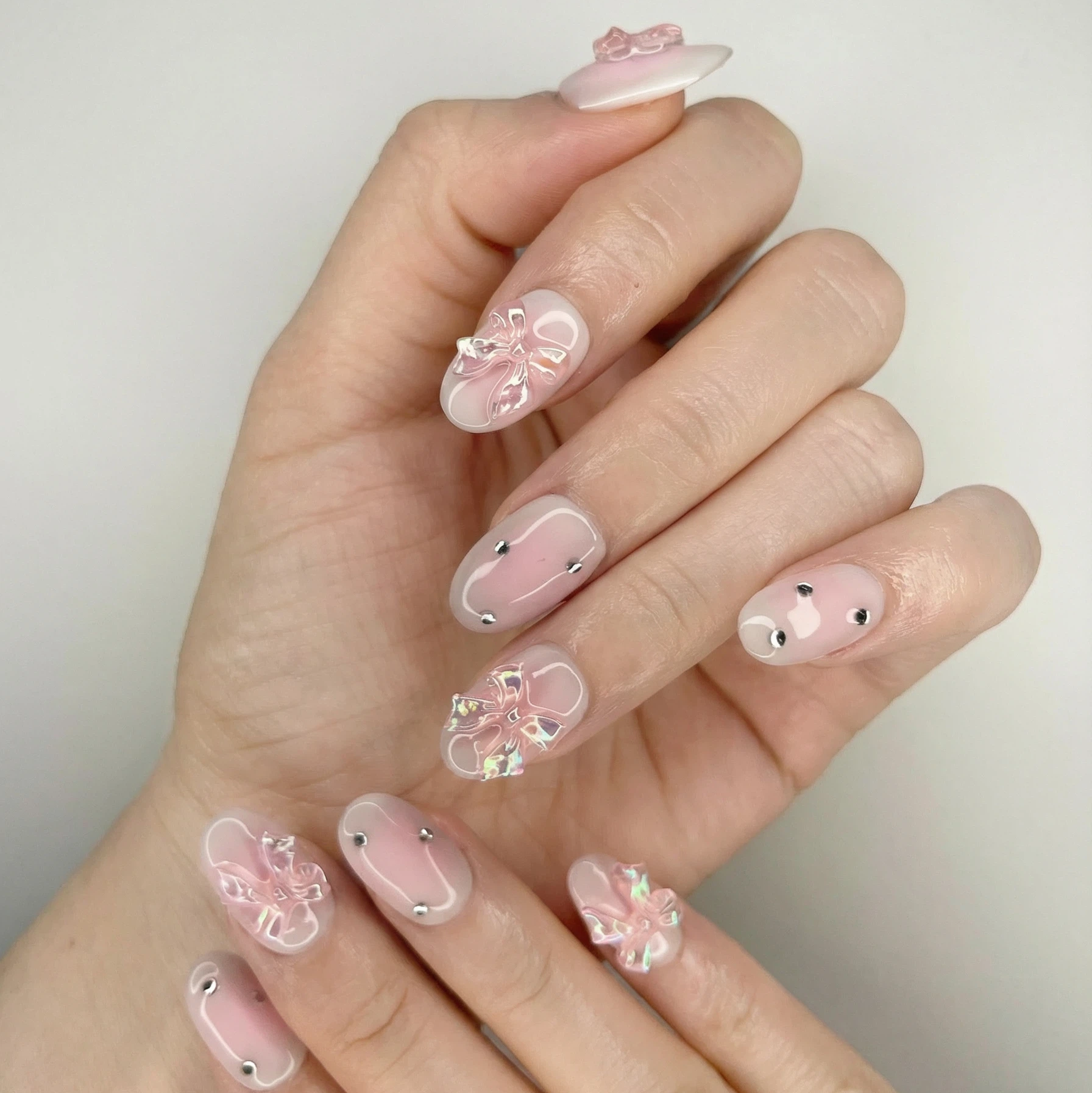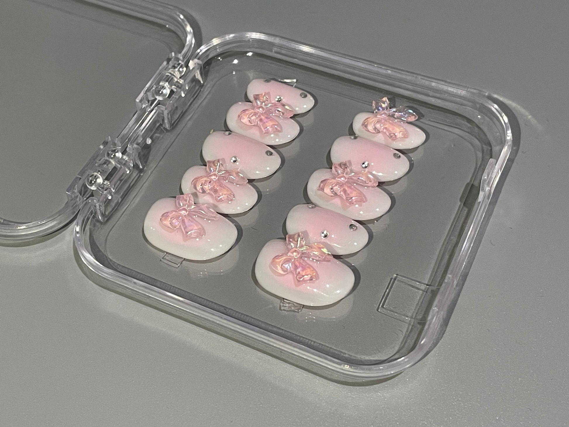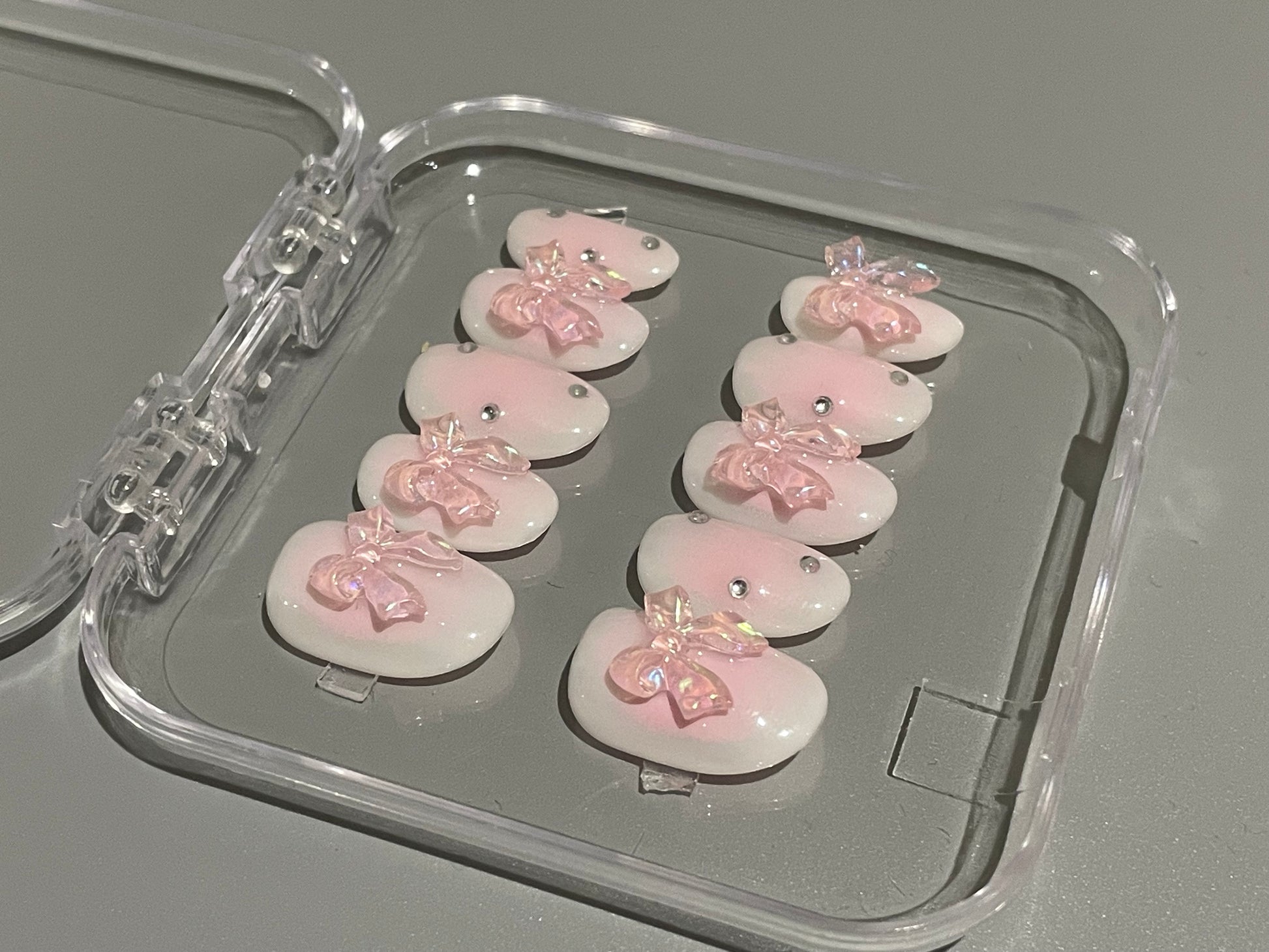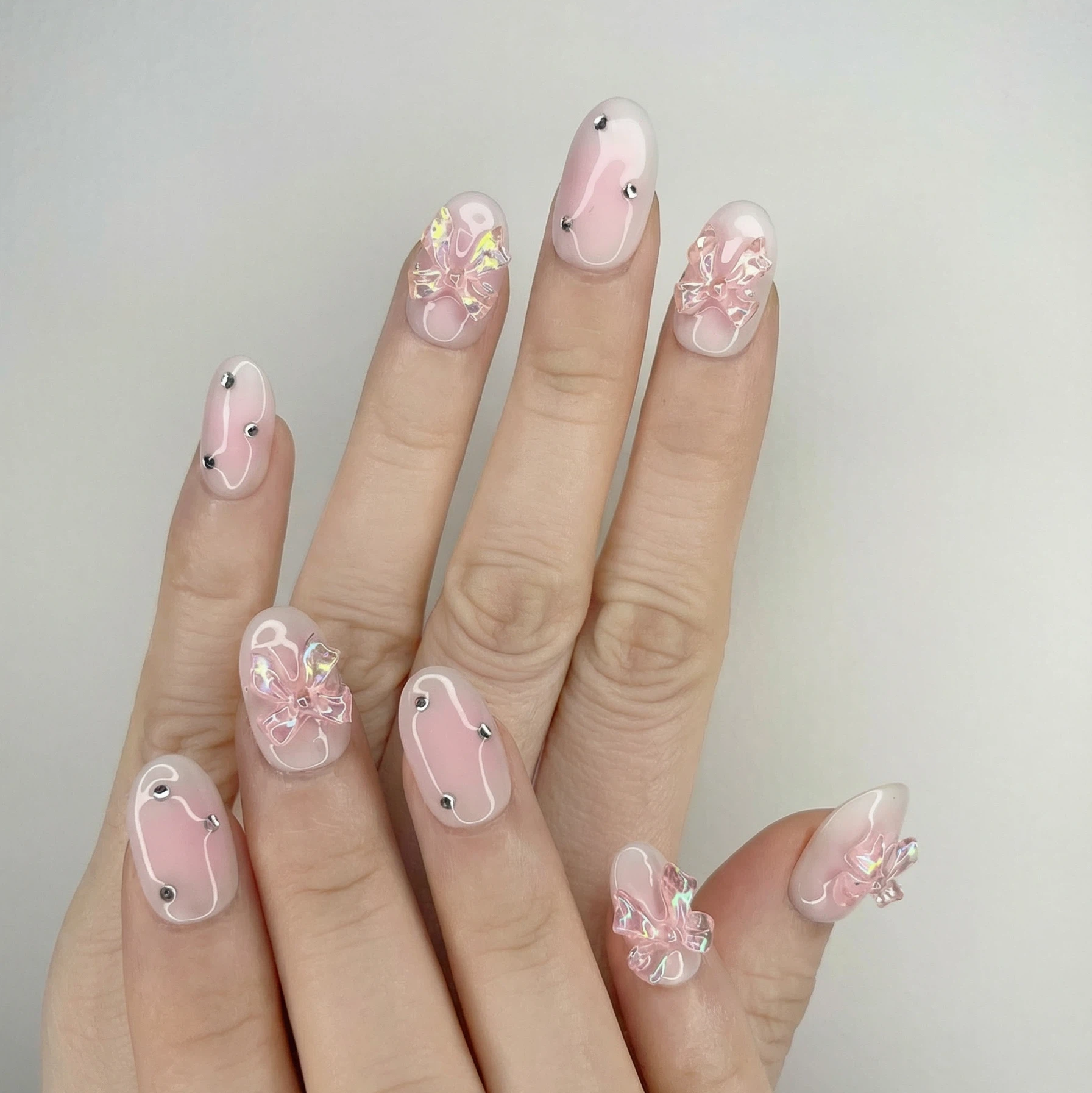 The Sugar Blush set features baby-pink bases with soft white outline details and shimmering iridescent 3D bows for the ultimate sweet, feminine look. Perfect for soft-girl styling, birthdays, bridal events, or anyone who adores delicate and dreamy nail designs.